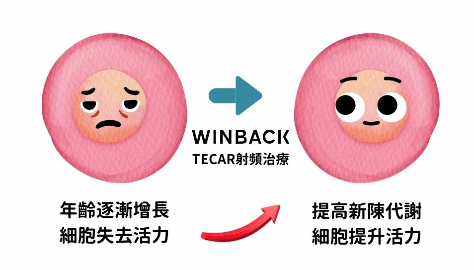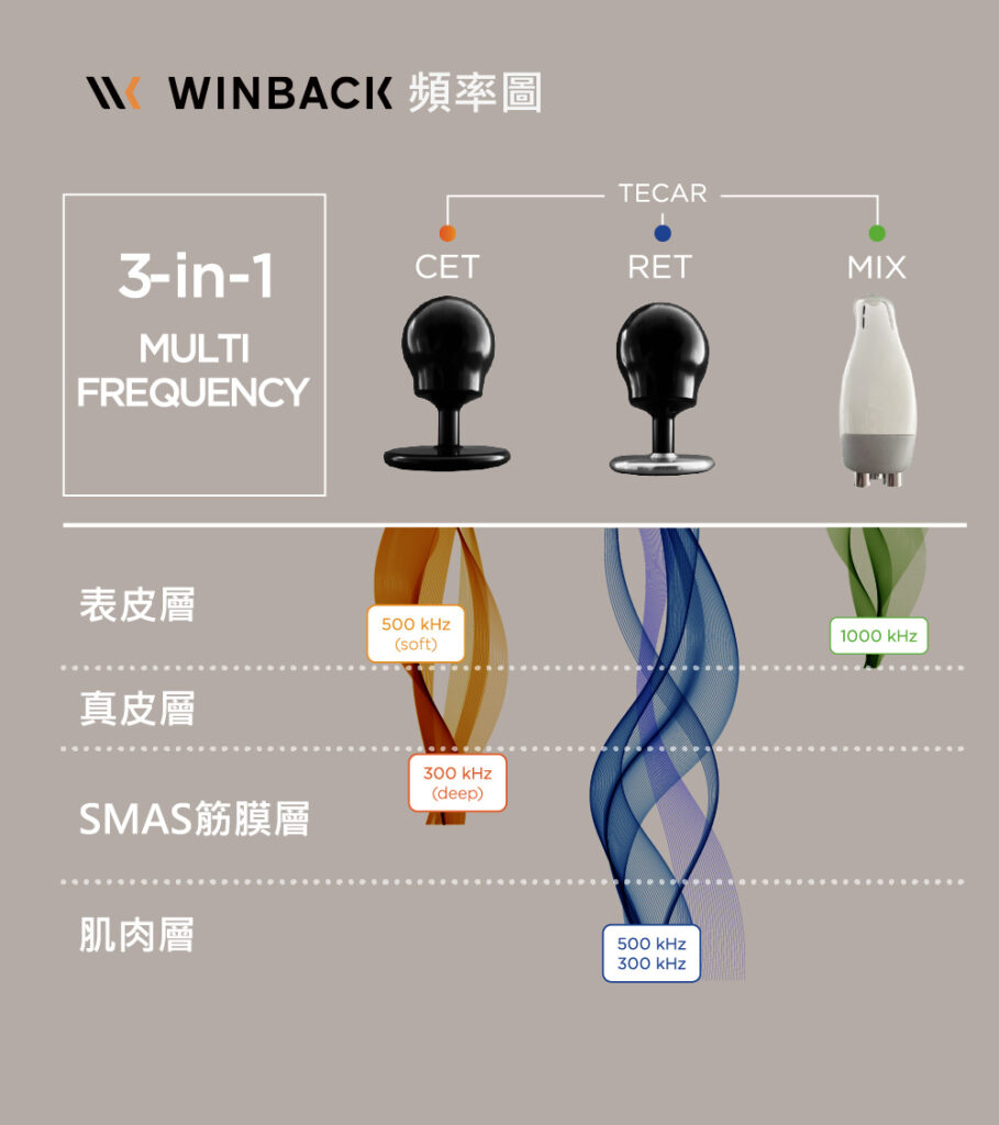 WINBACK 以高頻電流「從體內作用」,具生物修復、鎮痛與深層透熱;超音波易被組織阻力散射,雷射則為表淺光能刺激。WINBACK 作用深度更廣,並能提升循環、促進代謝。