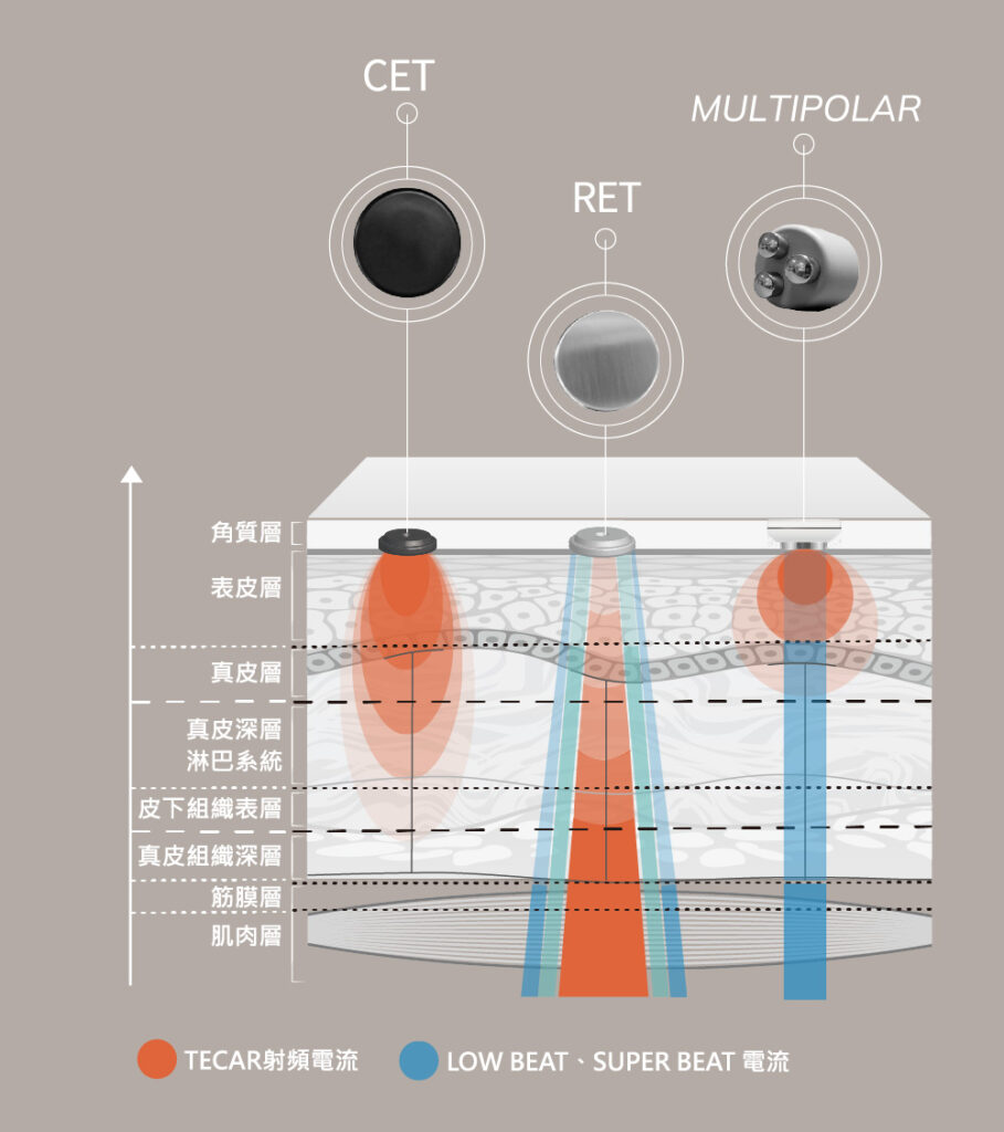 利用三種高頻率電流深入組織,啟動細胞內外的離子交換,打開離子通道,提升細胞能量流動與活性透過離子高頻能量穿透活化細胞,提升循環與代謝,促進氧氣流動,幫助身體加速修復、回到最佳平衡。